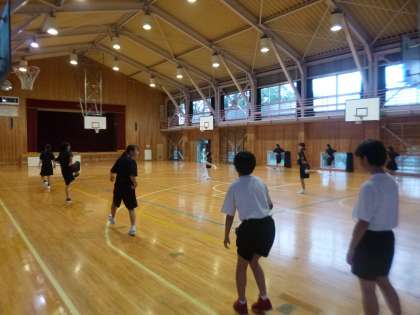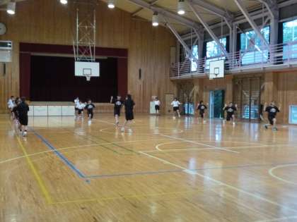 入念にアップし、大会に備えます。 ガンバレ、女バス!!