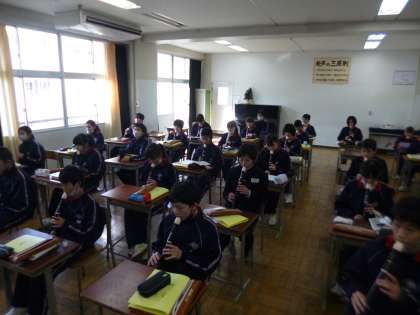 1Bは、音楽でリコーダーの練習をしています。「喜びの歌」の復習から、新しい課題に入っていきます。