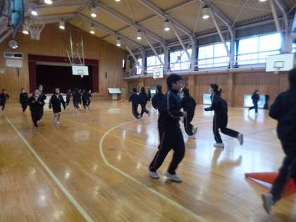 1Aは、体育館で持久走を行っています。冷たい雨が降ってきて、グランドから場所の変更をしました。