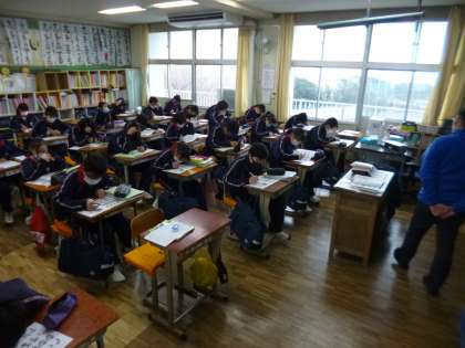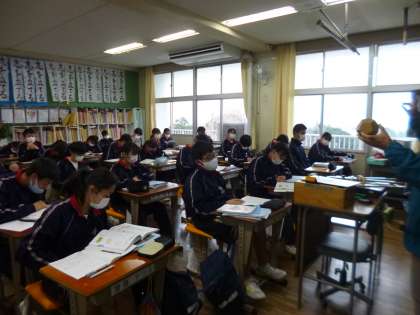1Cは、数学で、立体の学習を行っています。宿題の確認を、発言の内容で確かめています。自分のノートを目で追い、耳で聞いています。