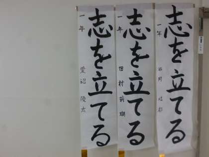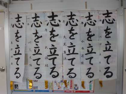 職員室前の廊下で、書き初めの優秀作品展を行っています。