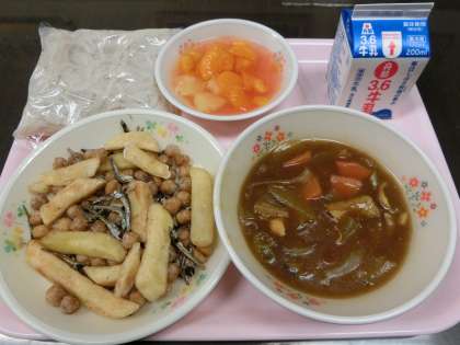 カレー南蛮(うどん・カレー汁) じゃがいもと小魚のから揚げ アセロラフルーツ 牛乳