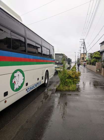 雨のため1時間遅れての集合。協力いただいた皆様ありがとうございました。自然教室、いよいよ出発です