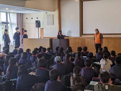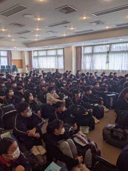 朝霧野外活動センターに到着しました。入所式で所員の方から説明を受けています。