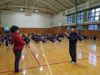 ふれあいタイムでご指導いただく所員の方に、愛中の紹介をしました。キャッチフレーズは「挑戦と笑顔です!」