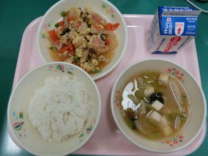 親子丼の具 豆腐とキャベツの味噌汁 牛乳 ごはん いただきます!