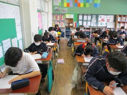 先生が言ったアルファベットを聞き取り、書いています。
