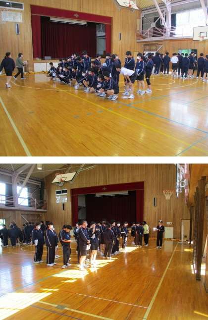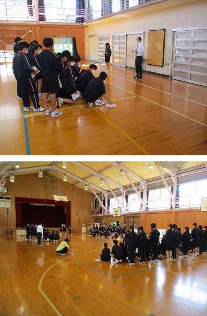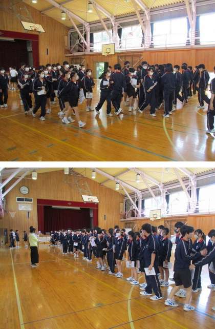 修学旅行に向けて、観光地などで素早く並べるように、いろいろな並び方(記念写真隊形)の練習をしています。