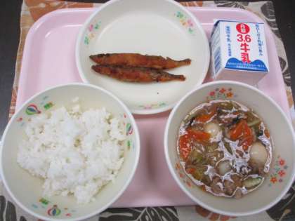 今日のメニューは、 ・中華丼の具 ・ご飯 ・ししゃもの竜田揚げ ・牛乳 です。