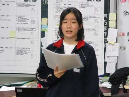 明日10日(土)に、市民文化センターにて、わたしの主張大会が開催されます。本校の代表として参加する生徒のリハーサルを職員室で行いました。「あいさつ」に関する考えを素直な気持ちでまとめられた内容です。明日も堂々と発表してくれることを期待しています。