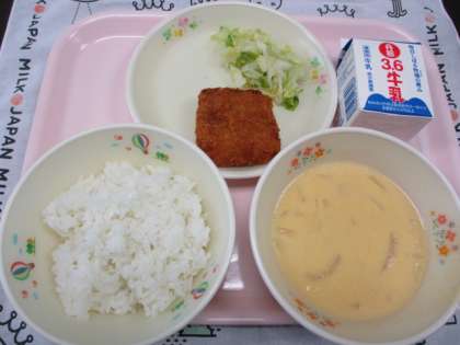 本日の献立では、丸型パン、ボイルドキャベツとなっていましたが、都合により、ご飯、キャベツソテーに変更させていただきました。