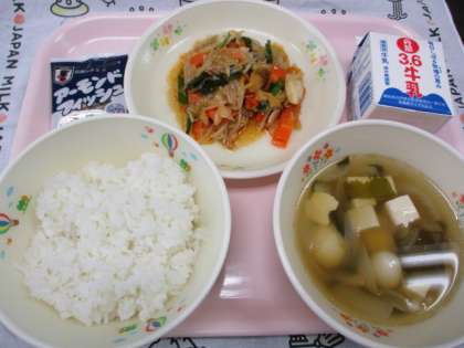 6月21日(水) 今日の給食 公開日 2023/06/21 更新日 2023/06/21 今日の給食 今日のメニューは、 ・豚キムチ ・うずらの卵とわかめのスープ ・ご飯 ・アーモンド小魚 ・牛乳 です。 いいね(0)