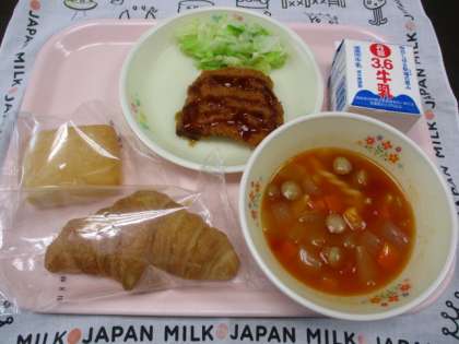 7月11日(火) 今日の給食 公開日 2023/07/11 更新日 2023/07/11 今日の給食 今日のメニューは、 ・ミルクパン、クロワッサン ・ぶりのフライ ・キャベツソテー ・マカロニ入りトマトスープ ・牛乳 です。 いいね(0)