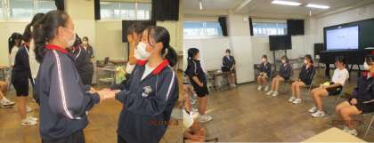 毎年、3年生の部活動でもっとも最後まで活動するのが吹奏楽部です。先日の鷹根祭で最後のステージとなり、今日は引退式を行いました。1〜2年生からは感謝の言葉を、3年生からは後輩たちへのメッセージを、互いに伝え合いました。一人一人の思いが、時には涙ながらに語られる感動の引退式となりました。3年生の思いを受け、次は2年生を中心によりよい部活動にしていってください!