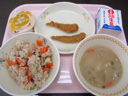 10月23日(月) 今日の給食 公開日 2023/10/23 更新日 2023/10/23 今日の給食 今日のメニューは、 ・秋の香りご飯 ・小鰯のカリカリフライ ・呉汁 ・梨ゼリー ・牛乳 です。 いいね(0)