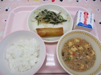 今日のメニューは、・麻婆豆腐・春巻き・もやしのナムル・ご飯・牛乳です。