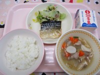 今日のメニューは、・焼き塩鯖・小松菜のソテー・豚汁・ご飯・牛乳です。