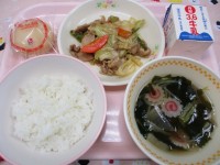 今日のメニューは、・回鍋肉・中華スープ・中華風蒸しパン・ご飯・牛乳です。
