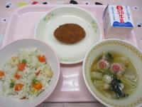 今日のメニューは、・えびピラフ・いかメンチカツ・青のり団子のスープ・牛乳です。