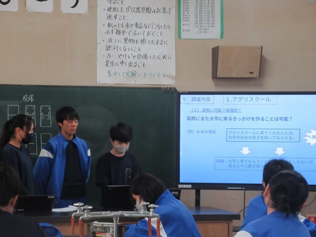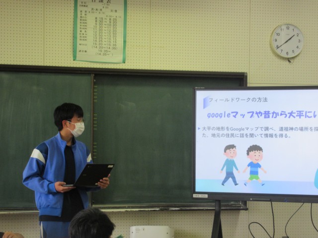 本日、総合的な学習発表会が行われました。併せて、第2回学校運営協議会を開催して、委員の皆様とこれまでの探究の過程でお世話になった方々にも発表を見ていただきました。3年生の発表内容はわかりやすく、クイズなどを交えて楽しめるものでした。2年生1年生は、来年に向けてさらなる学習を進めていく気持ちになったのではないでしょうか。有意義な時間となりました。