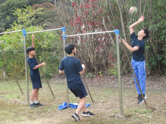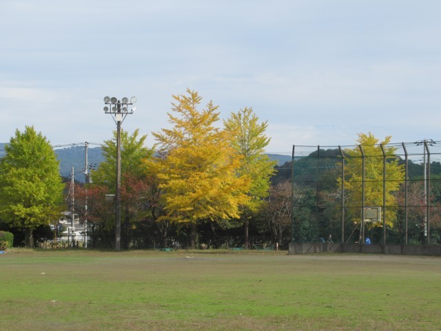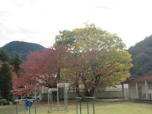 昼休み、外で元気に遊ぶ生徒もいます。秋が深まり、校庭の木々も色づいています。