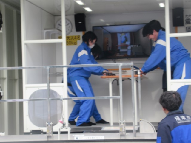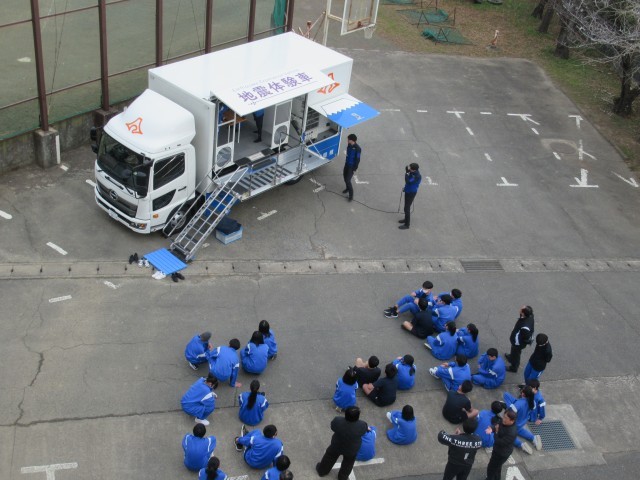 避難訓練の時間には、危機管理課に依頼して起震車に来てもらいました。震度7の揺れを体験しました。かなりきつかったです。