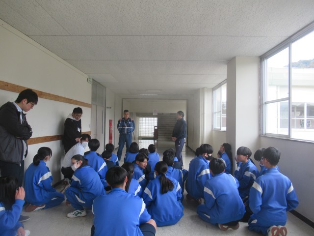 また、大平消防署に依頼して、煙体験をしました。柔道場に煙をたいて、火事のときの困難さを体験するものでした。思っているよりも何も見えず、大変なことが身にしみました。生徒のこれからの災害時に役立つといいと思います。