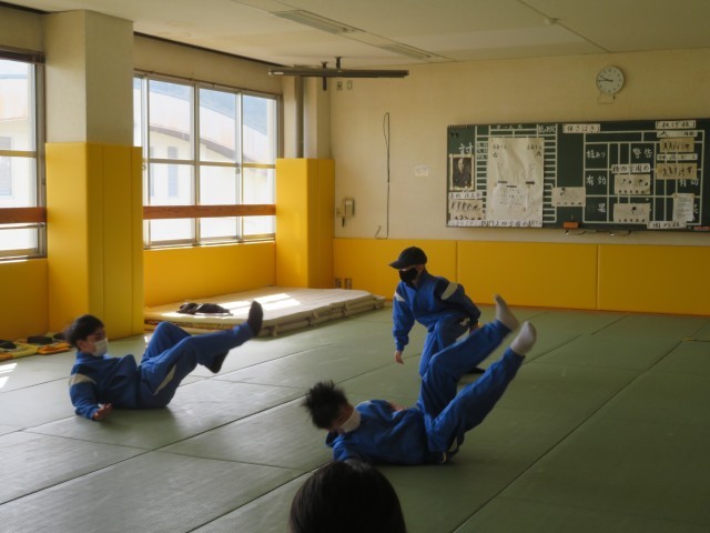 保体では、柔道の授業をしています。難しいなあ、とつぶやきながら、真剣に取り組んでいます。柔道場の畳の部屋で実施しています。