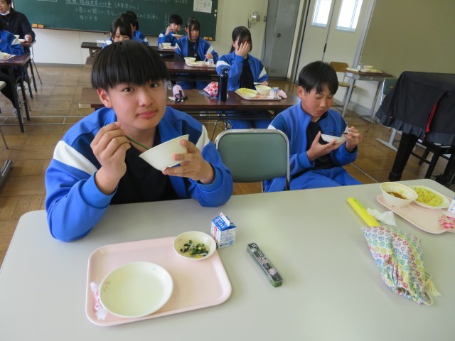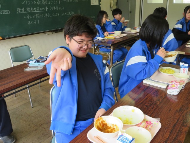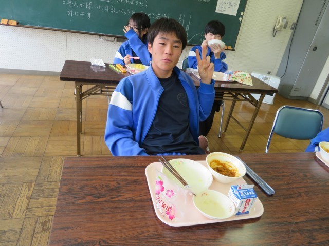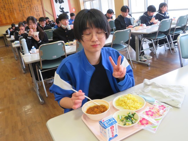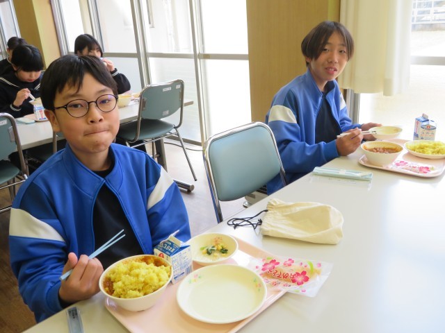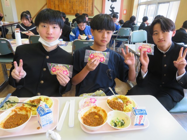 今日の給食はキーマカレーでした。「卒業おめでとう」と印刷された袋に入ったクレープがデザートにつきました!とっても美味しかったです。みんな満足です。