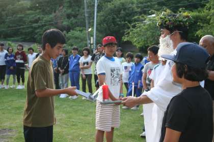 いよいよキャンプファイヤーです。戸田峠に住む「火の神」から、赤カラーには「友情」の火を、青カラーには「愛」の火を、黄色カラーには「団結」の火をいただきました。