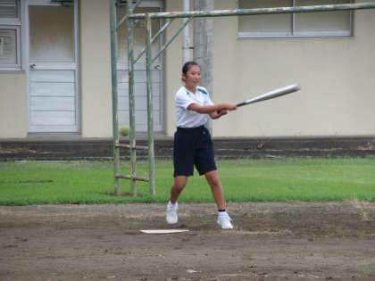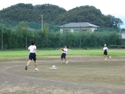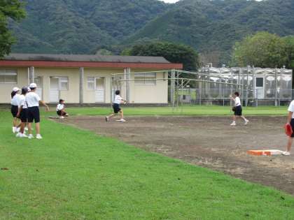 クラスが2チームに分かれ、ソフトボールの試合をしています。