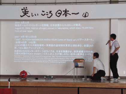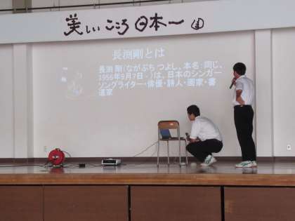 「美しいこころ 日本一」を目指し、生徒から自発的に企画案が上がり、教職員と生徒に向けてプレゼンをしています。