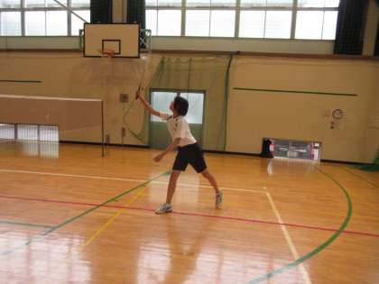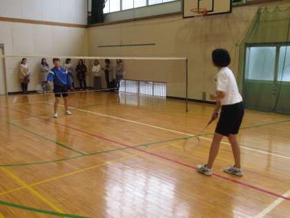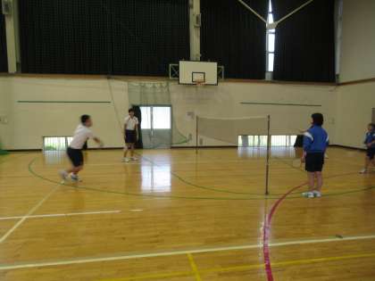 バトミントンに取り組んでいます。ローテーションしながら、試合を行っています。