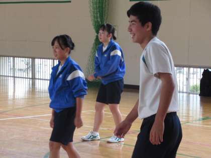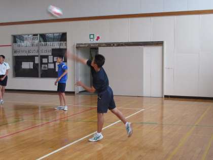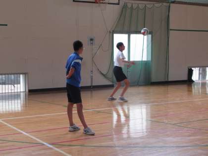 雨が降ってしまい、体育館でバレーボールの学習をしています。バレー部の生徒がよくリードしてくれています。