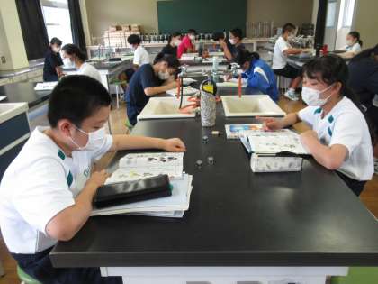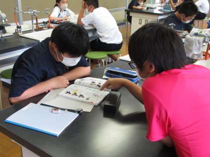 顕微鏡の使い方、名称について確認しています。また、ルーペについても操作方法を学んでいます。