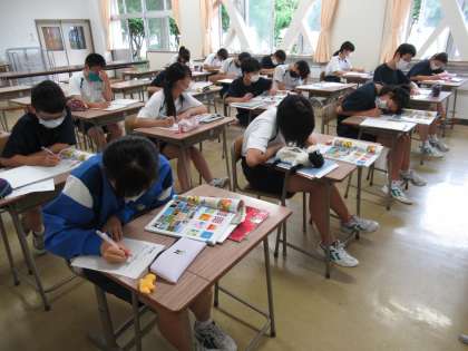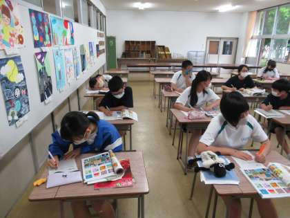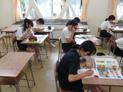 色面構成について学習しています。まずは実物をスケッチし、その後、単純化、省略、強調を行い作品に仕上げていきます。