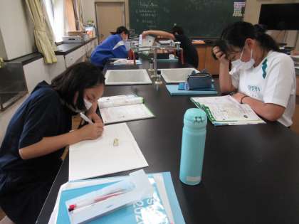 待ちに待った、ALTのジャッキー先生をお迎えしての授業です。自分達からも自己紹介するため、その紹介文を考えています。