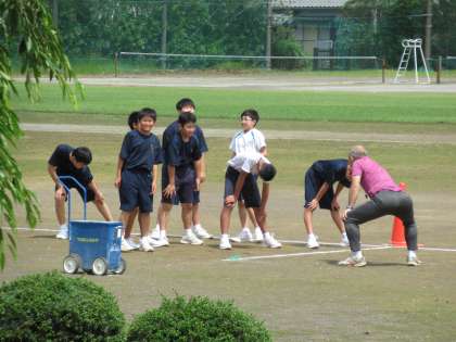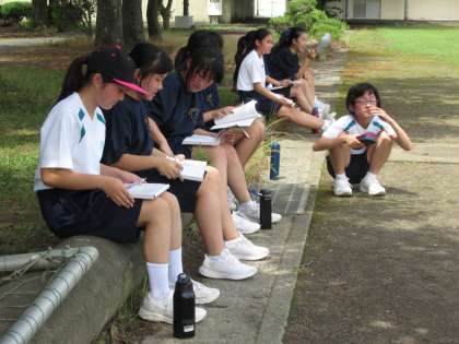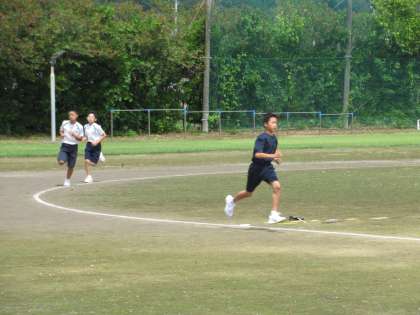 熱中症に配慮しながら、持久走を行っています。教科担任も一緒に走っています。
