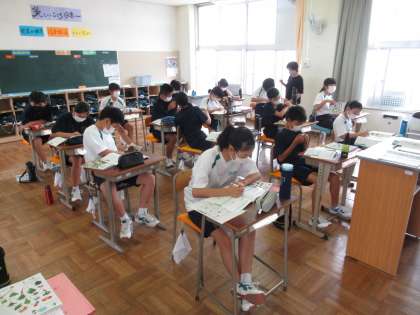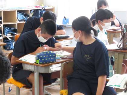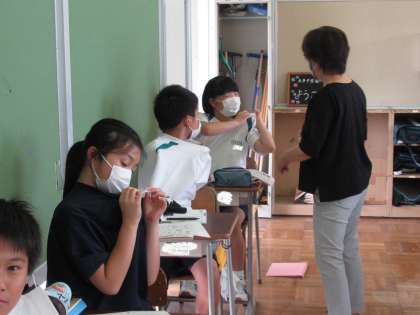 衣服のはたらきについて学習しています。サイズや組成表示などを実際に確認しています。