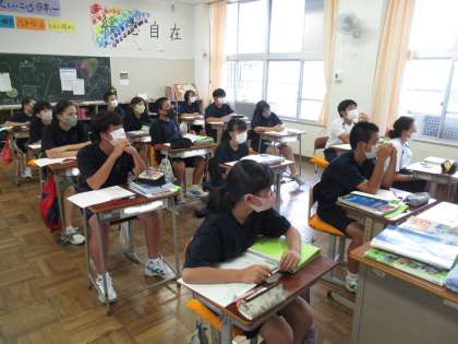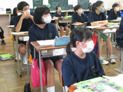 「世界のさまざまな気候と人々の生活」を学習しています。ディスプレイの気温や雨量のグラフを見ながら生活スタイルを考えています。