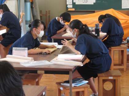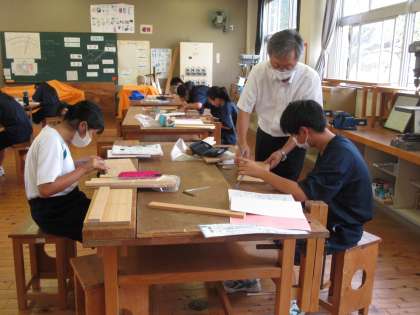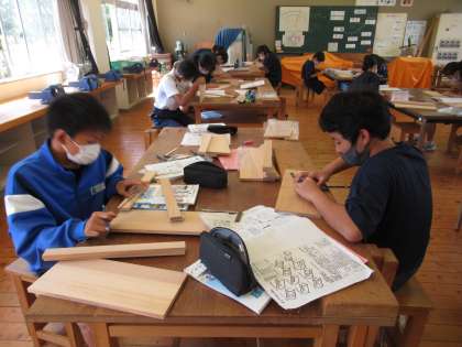 木材加工に取り組んでいます。個々が選んだ本箱を、一枚の板から作り上げています。