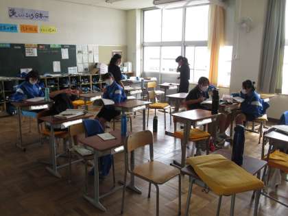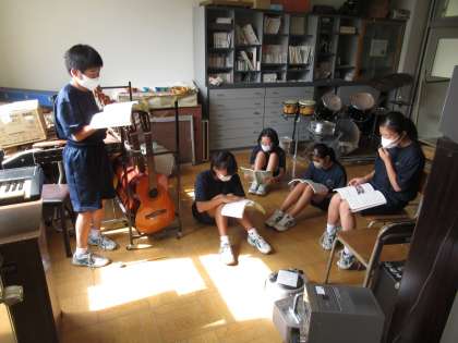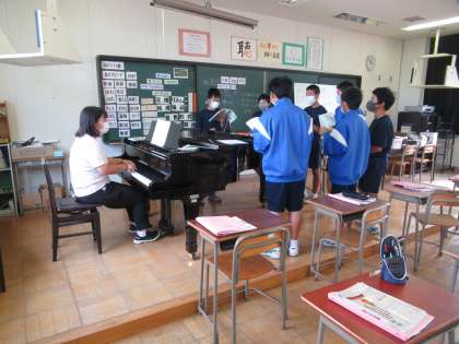 パートごとになり、合唱曲の練習をしています。歌い終わるごとに振り返りを行い、意欲的に追究しています。