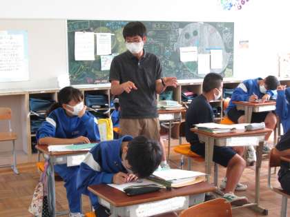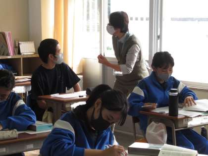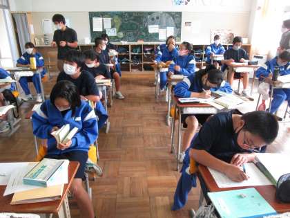 「お菓子とわたし」というテーマで作文を書いています。はじめに全体の構成を考えてメモを書き出し、いよいよ原稿用紙にまとめています。