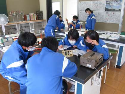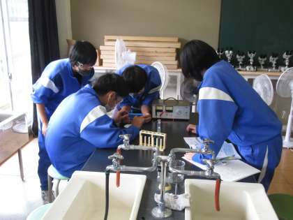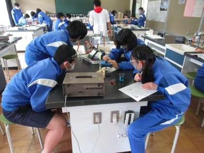 塩化銅水溶液の電気分解を試みています。それぞれの極に発生している物質が何であるか特定しています。