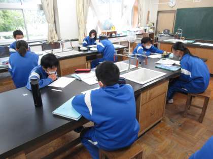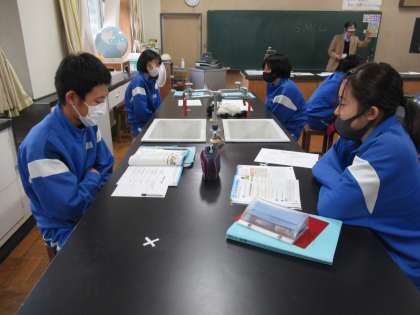 全体でスキットの内容を確認した後、ペアで役割分担して会話練習をしています。