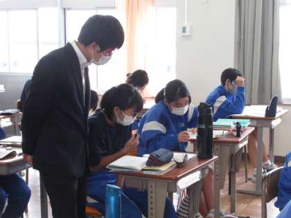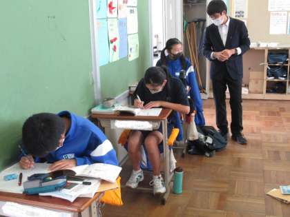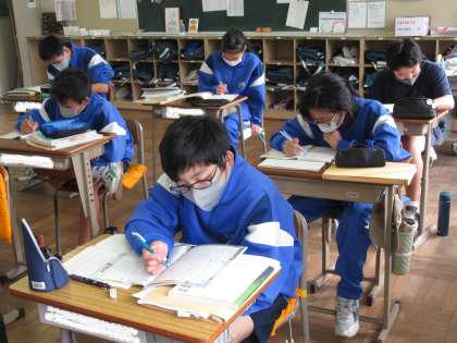 文法の学習を行っています。接続語や独立語などの例を考えた後、文法ワークで整理しています。