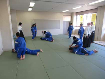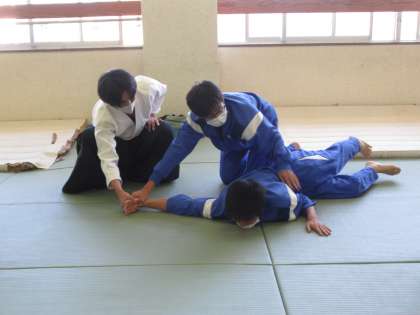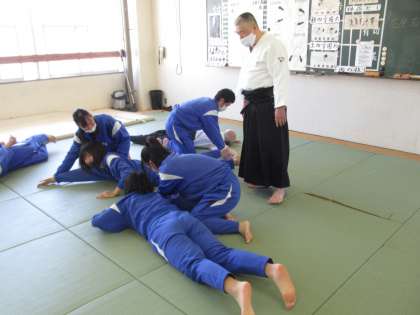 静岡県の体育実技指導協力者派遣事業に協力をいただき、5名の指導協力者をお招きし、合気道を学びました。礼の仕方から護身の技まで、楽しく真剣に学ばせていただきました。