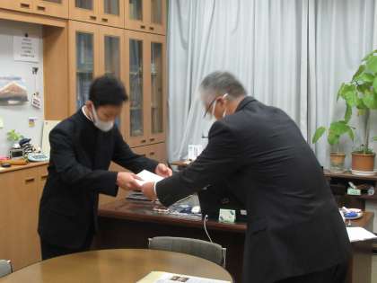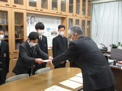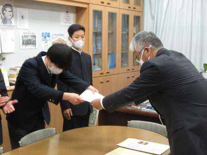 昨年の台風19号の被害を受けた際、率先して地域のために活動をした現在高校1年生の6名に対し、日本善行会より善行感謝状が授与されました。校長室に6名が集い校長先生から感謝状が渡されました。静岡新聞社も取材に駆けつけてくださいました。