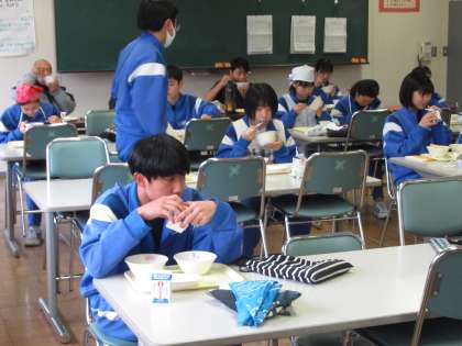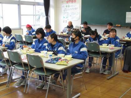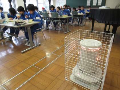 食べ終わった人から片付けを行っています。エアコンのないランチルームでは、ストーブがありがたいです。