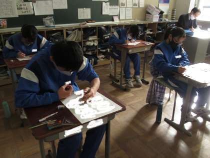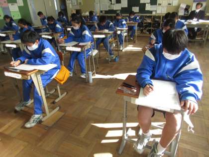 県下一斉に学力調査が実施されました。国語、社会、数学、理科、英語の5教科について取り組んでいます。緊張感が漂います。